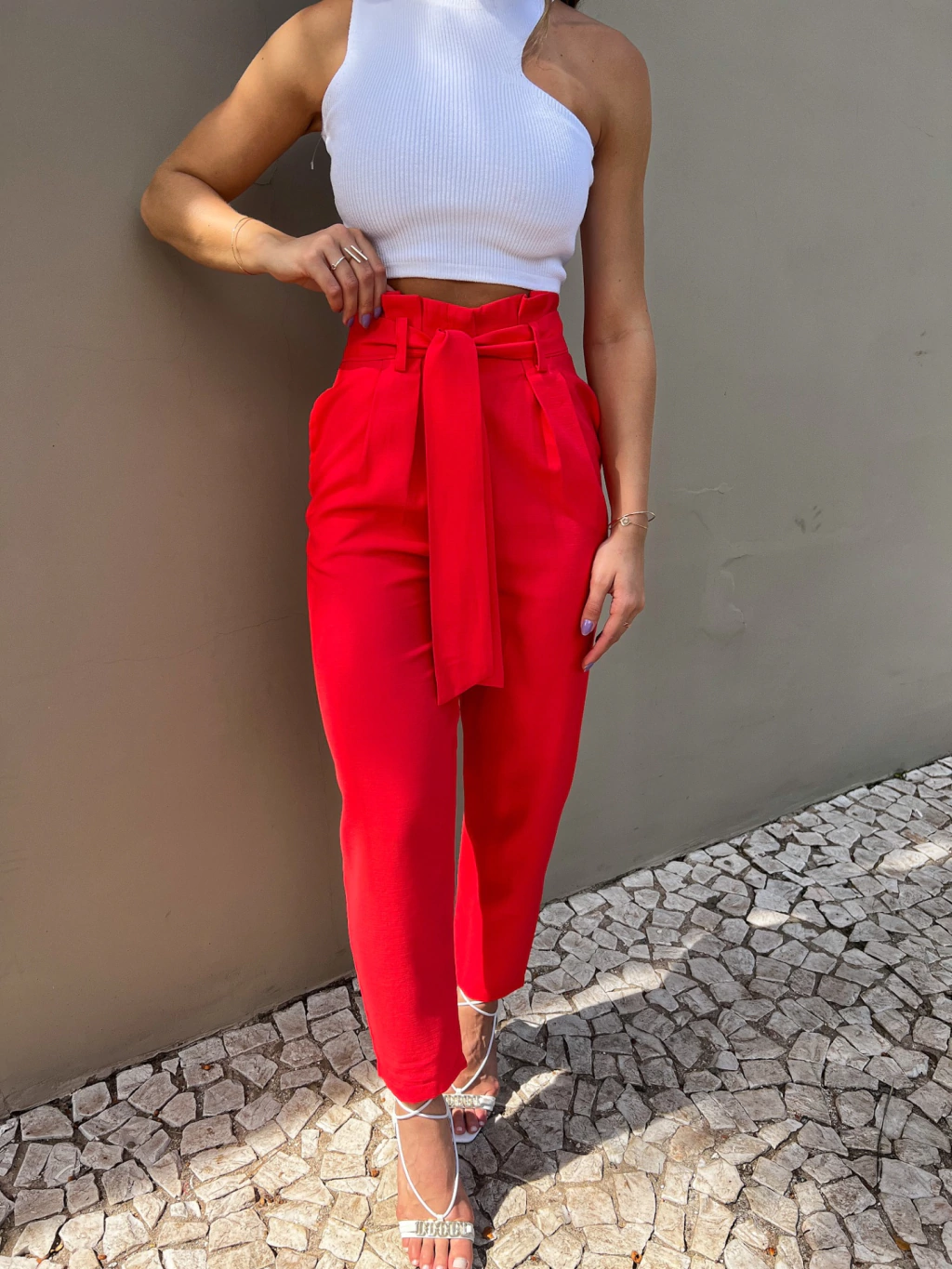 Calça com cintura alta e detalhe de cinto no mesmo tecido, que realça a silhueta com elegância. Modelagem moderna e caimento impecável, perfeita para compor looks versáteis e estilosos.